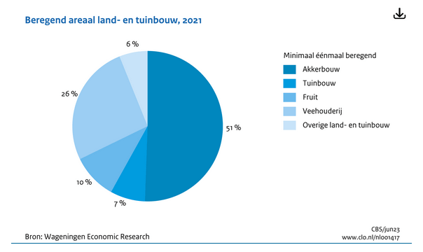 Het watergebruik binnen de land- en tuinbouw daalde in 2021 ten opzichte van 2020. De jaren 2018 tot en met 2020 waren relatief droge jaren waarbij het watergebruik hoger lag. Irrigatie vraagt het meeste water op de land- en tuinbouwbedrijven.