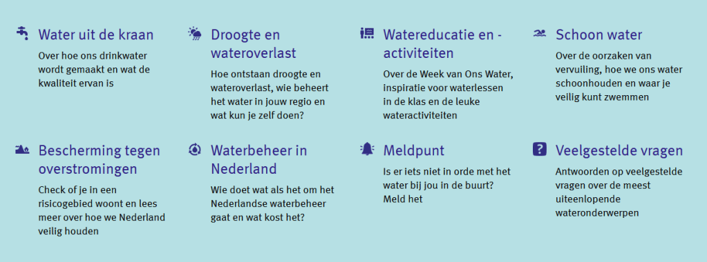 Wil je weten waar je veilig kunt zwemmen? Hoe je je tuin watervriendelijk maakt of wat je moet doen bij een dreigende overstroming? Dit en meer vind je op onswater.nl. Dé website over schoon en voldoende water en waterveiligheid.