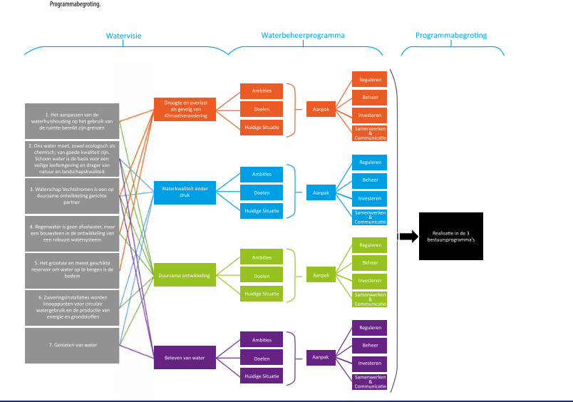 Onze Watervisie benoemt zeven hoofdlijnen, maakt een doorkijk naar 2050, richt het denken en werken van de waterschapsorganisatie en biedt belanghebbenden duidelijkheid hoe we het gesprek over de leefomgeving insteken en we moeilijke keuzes niet willen ontwijken.