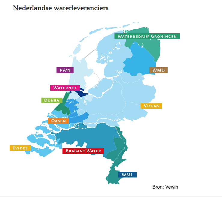 De regio waarin jij woont bepaalt van wie je water afneemt. Op de kaart zie je welke van de 10 Nederlandse leveranciers in jouw regio water levert. Als je twijfelt over de regio ga dan naar Vewin.nl, vul je adresgegevens in en je ziet zo welke waterleverancier verantwoordelijk is voor jouw regio.