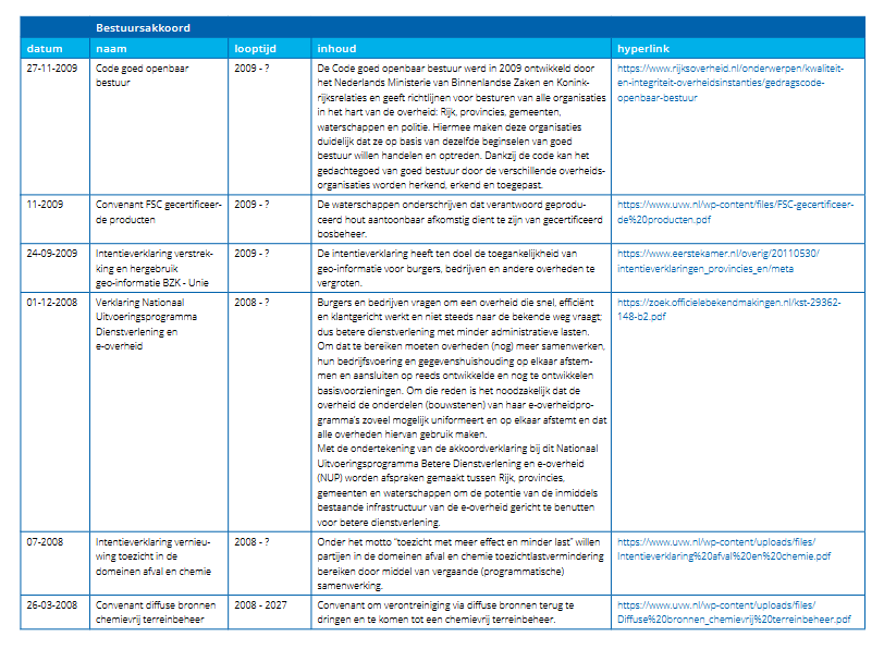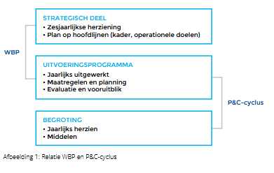 Tevens wordt een eenduidige koppeling tussen het WBP en de jaarlijkse (meerjaren)begroting aanbevolen. Deze kan gemaakt worden door een (jaarlijks te herzien) uitvoeringsprogramma te hanteren, dat uitwerking geeft aan het beheerprogramma en input vormt voor de begroting. Administratief kan dit een forse uitdaging zijn als het WBP uitgaat van integrale doelen als ‘bijdragen aan energietransitie en circulaire economie” en de begroting uitgaat van operationele doelen gekoppeld aan de kerntaken (waterkwaliteit, waterkwantiteit en waterveiligheid). Er moet dan een koppeling gemaakt worden tussen deze operationele doelen en de integrale doelen, om te kunnen beargumenteren op welke wijze het waterschap invulling geeft aan bijvoorbeeld de energietransitie. Of en in welke mate een dergelijke vertaling nodig zal zijn, zal verschillen per waterschap. Ook de mate van detailniveau van doelen en maatregelen kan de koppeling tussen het WBP, de begroting en het coalitieakkoord lastig maken. De waterschappen zijn geen voorstander van een vast landelijk format, met name om de noodzakelijke koppeling met eigen gebied en beheerpraktijk niet te verliezen. Wel wordt gestreefd naar gezamenlijke uitwerking van planonderdelen die voor alle waterschappen gelden. Bijlage 4 bij deze handreiking bevat een overzicht van bestuursakkoorden, green deals etc. die op nationaal niveau zijn afgesproken en mogelijk relevant zijn voor waterschappen om te noemen of om rekening mee te houden in hun WBP. Bijvoorbeeld hoe in een WBP energiebeleid en maatregelen terug kunnen komen.