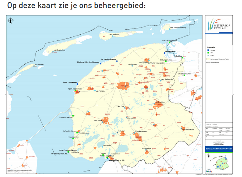 Als je kijkt naar het beheergebied, zijn wij het grootste waterschap van Nederland. Ons beheergebied is maar liefst 355.000 hectare groot en beslaat heel Fryslân, de 4 Friese Waddeneilanden en een deel van het Groninger Westerkwartier. Het gebied bestaat uit 19 gemeenten, waarin ruim 645.000 mensen wonen.